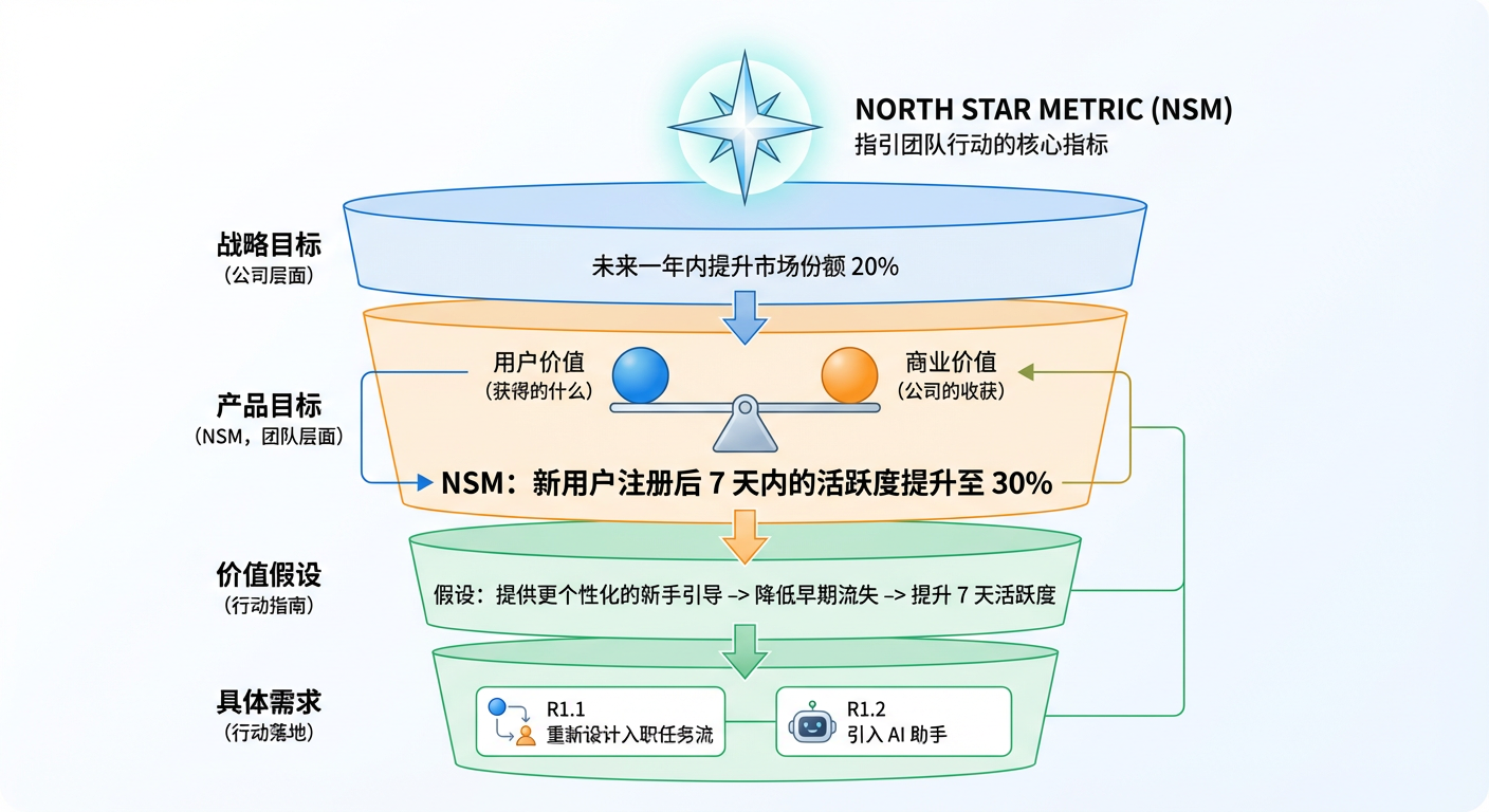 - 产品目标(NSM,团队层面):为了支撑战略,我们将 NSM 定义为“新用户注册后 7 天内的活跃度提升至 30%”。这是一个既体现用户粘性,又预示未来商业增长的关键指标。