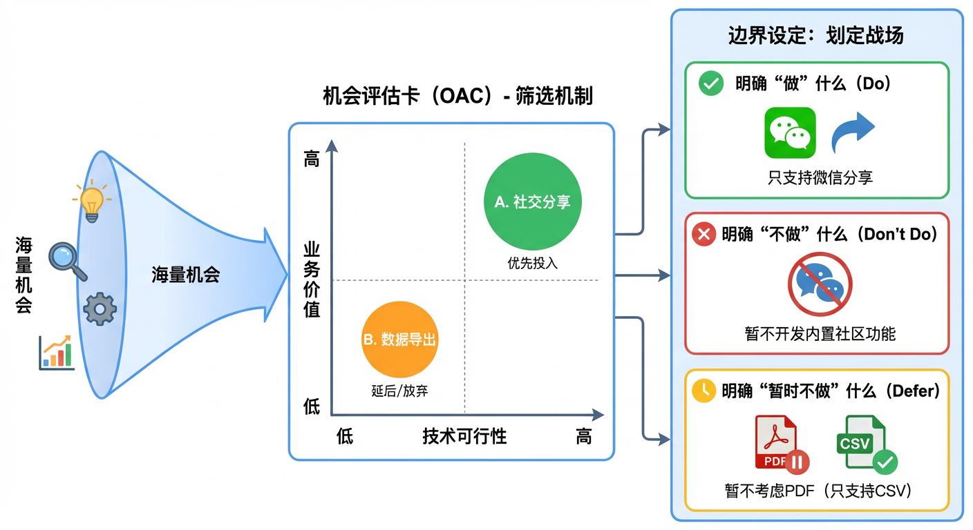 战略对齐后,我们会面对海量的机会。但资源是有限的,并非所有符合战略的机会都值得立即投入。我们需要建立一套科学的机制来进行机会筛选和边界设定。