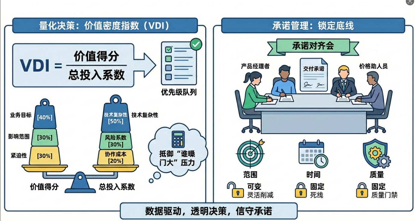 VDI 越高,意味着该需求性价比越高,理应优先排期。这种量化方法能有效抵御“谁嗓门大谁优先”的压力。