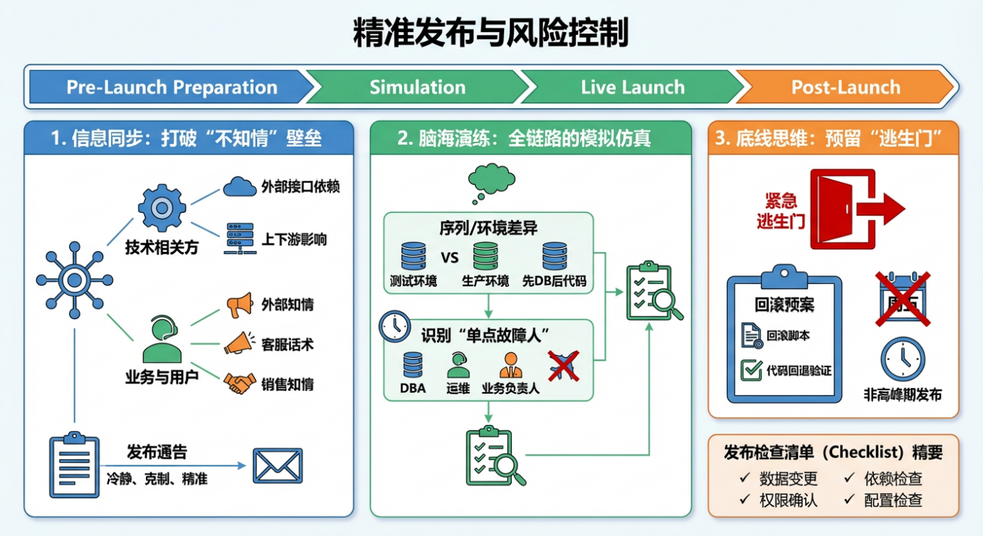 大部分发布事故的根源,不是技术难题,而是“该知道的人不知道”。产品经理需要像维护“利益相关者地图”一样,维护发布的信息流。