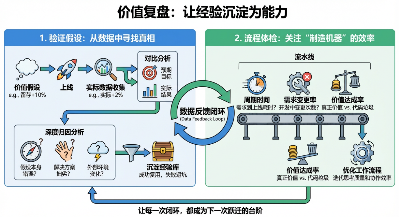 我们需要建立严格的数据反馈闭环,验证最初的价值假设是否成立,并审视流程本身的健康度。
