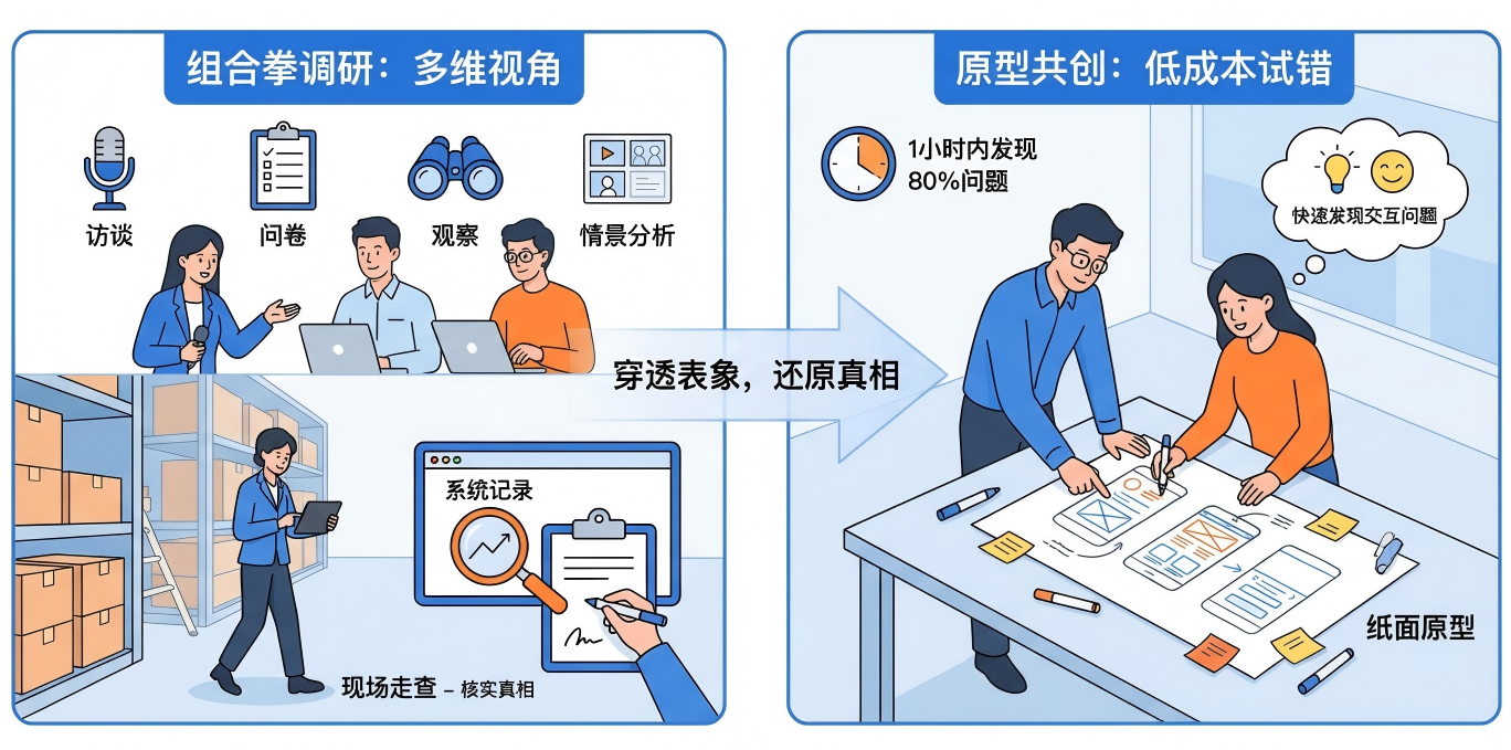 - 组合拳调研:综合运用访谈、问卷、观察、情景分析。对于关键流程,必须进行现场走查,核实实际操作与系统记录的差异。