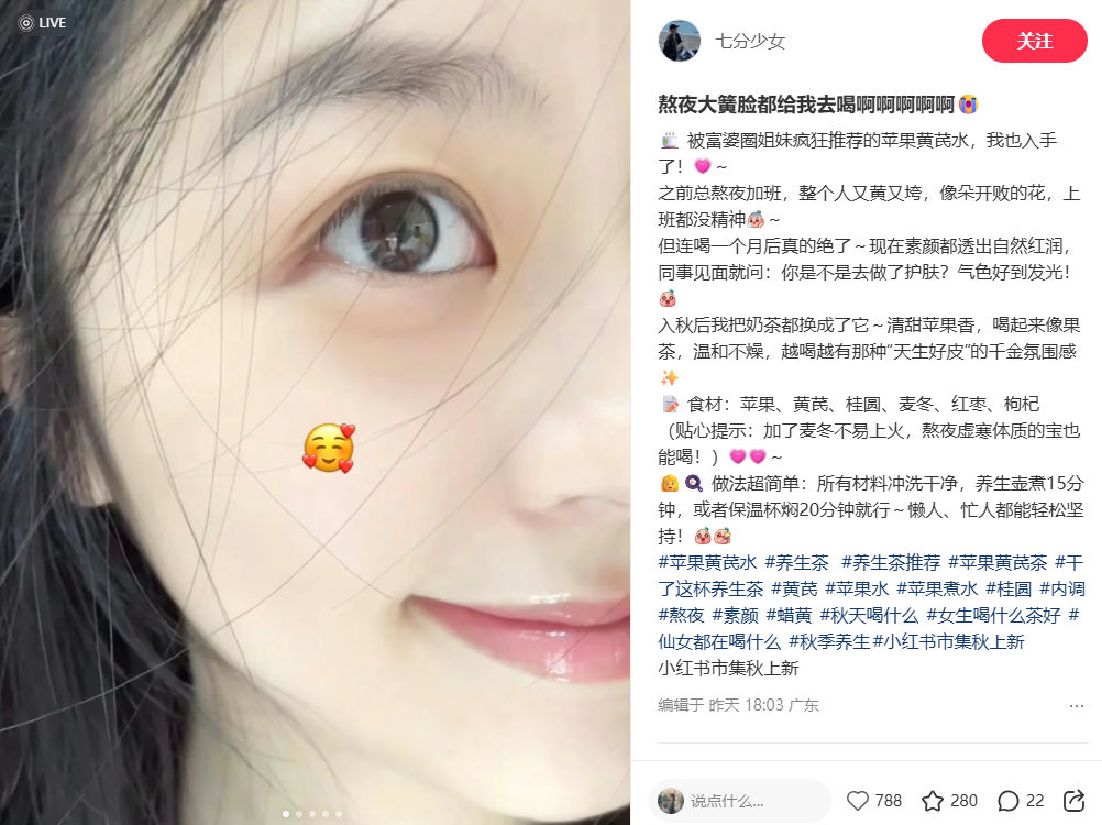 ② 结果导向表达:新增 “喝完红光满面”“素颜上镜不卡粉”“熬夜大黄脸改善” 等表述,直接击中年轻女性核心诉求,缩短转化路径(如 “七分少女” 笔记强调 “连喝一个月,素颜透出自然红润”)。