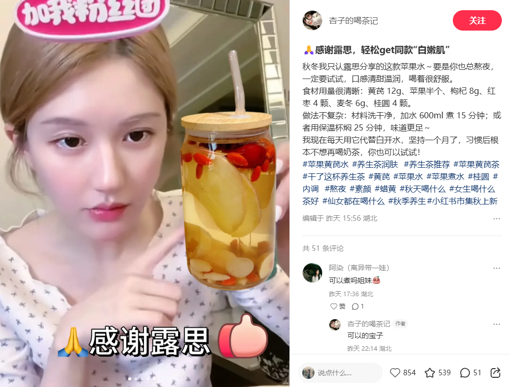 ① 借明星热点:大量产出 “赵露思同款” 关联内容,主打 “素颜好气色”“熬夜内调”,快速借势起量(如 “杏子的喝茶记”“娜娜的小手记” 均以 “感谢露思” 为切入点);
