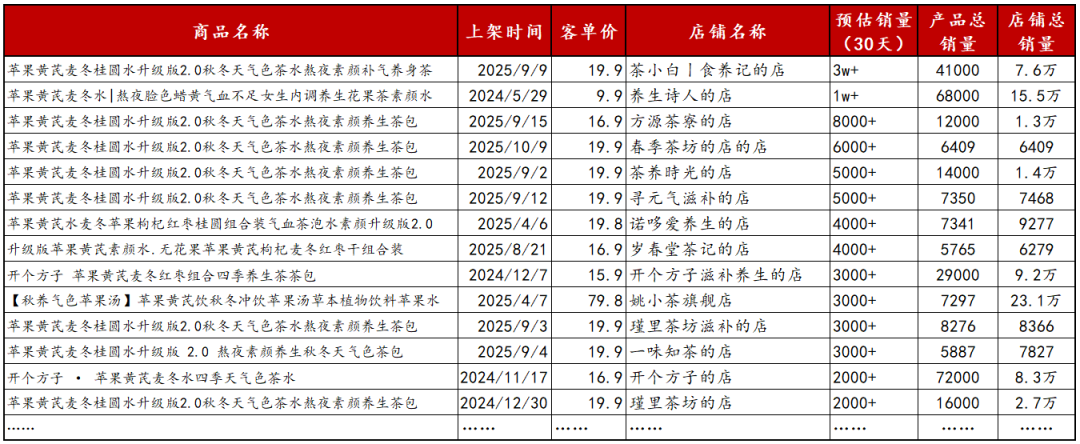头部产品业绩:表现最亮眼的产品(“苹果黄芪麦冬桂圆水升级版2.0”)于2025年9月9日上架,不到2个月总销量便突破4.1万。
