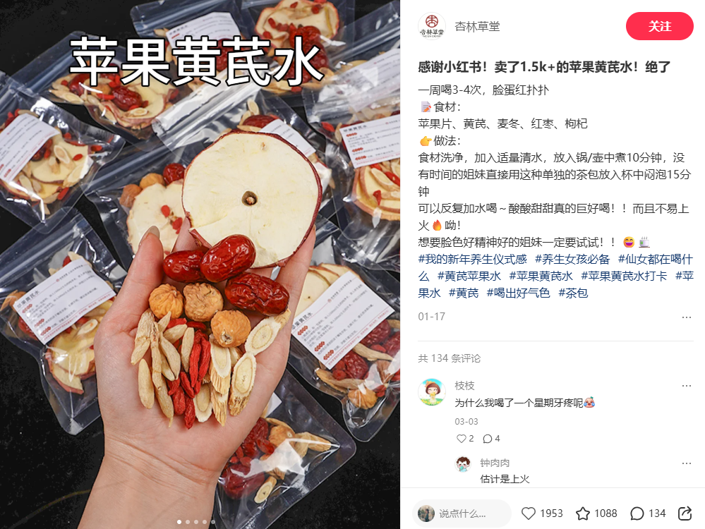 低门槛优势:食材常见(苹果、黄芪)、煮法简单(加水煮 15 分钟),无需专业养生知识,适配大众 “轻养生” 刚需,降低尝试门槛;