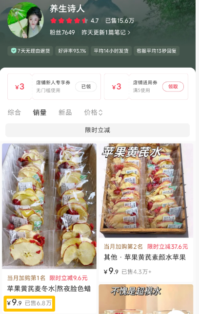 最近刷小红书,10个养生帖里8个在推苹果黄芪水!近30天130家店铺疯卖,表现最亮眼的产品于2025年9月9日上架,不到2个月总销量便突破4.1w件。