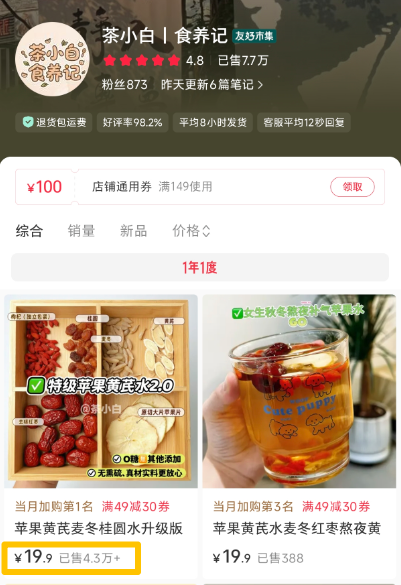 格局:呈现 “白牌主导 + 品牌补充” 的格局。其中70% 以上为白牌店铺,主打高性价比 + 即时功效,依托小红书种草快速成交;姚小茶、花姐食养等品牌(占比 30%左右)客单价稍高,与白牌形成差异化互补,覆盖不同消费能力用户。