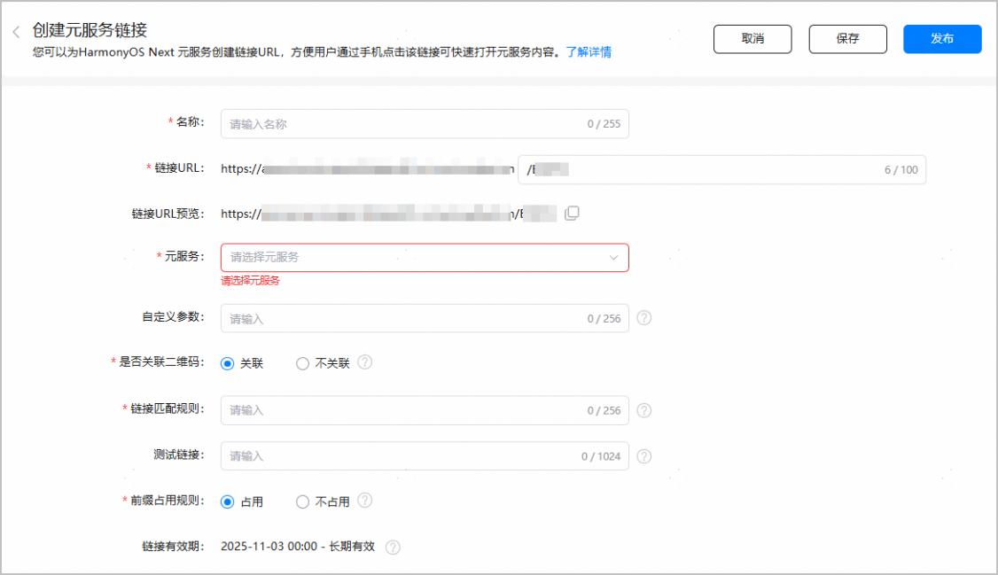 4、调测确认无误后可点击“发布”,AGC会判断当前时间是否在链接有效期内,并实时更新元服务链接状态:“待生效”、“已生效”或“已失效”。