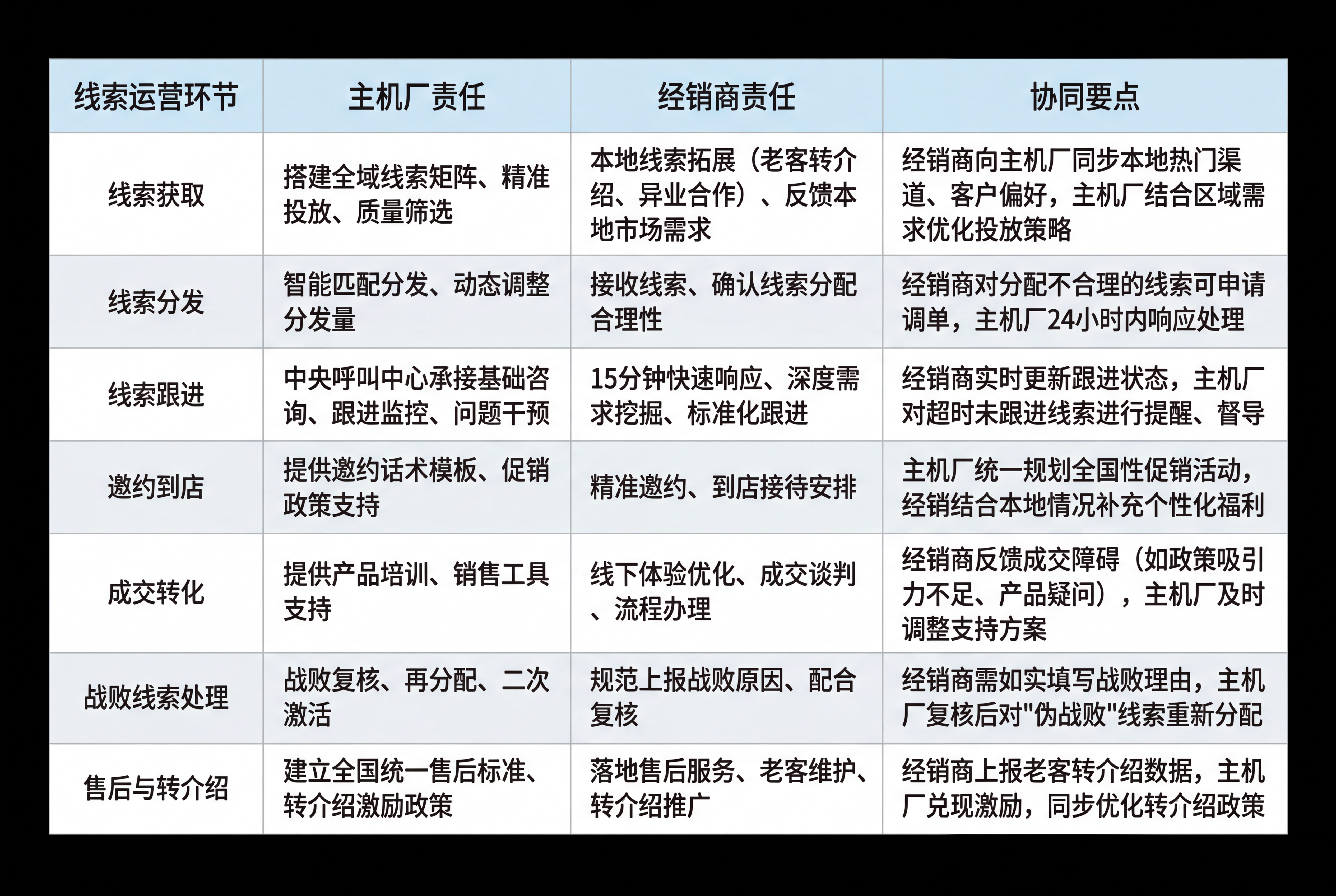 - 若为经销商能力或资源问题,主机厂提供针对性支持(如临时调配人员、补充培训);若为线索质量问题,主机厂将线索纳入战败复核流程。