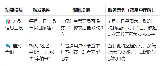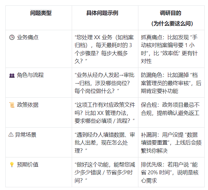核心动作:用 “需求调研表” 把模糊需求拆成具体问题,重点问基层经办人(他们最懂实操),避免只听领导笼统要求。以政务办公系统为例,别问 “你需要什么功能”,按以下 5 类问题逐一确认: