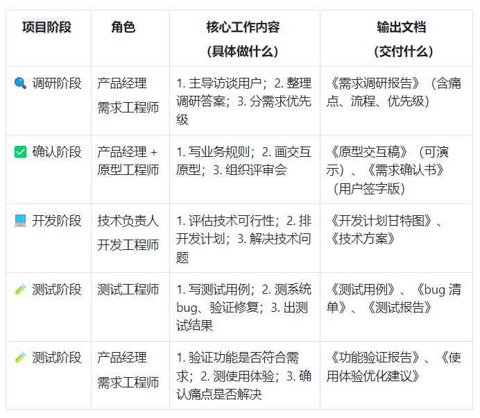 以下是 “从调研到测试” 的全阶段角色分工表,覆盖核心动作与输出: