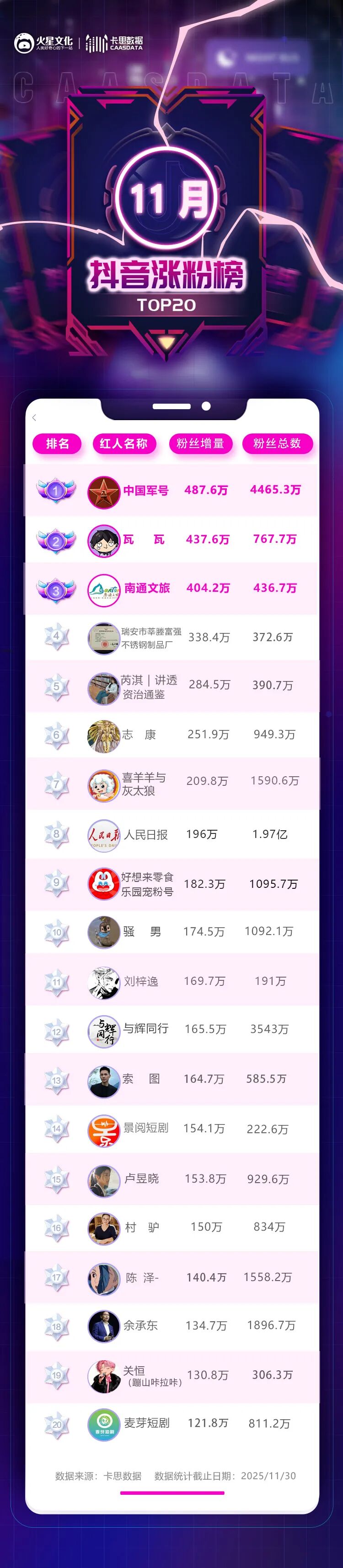 以上就是卡思对11月抖音涨粉榜的全部分析。