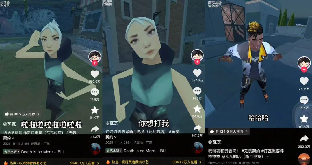 其中,游戏账号@瓦瓦 目前只发布了10条作品,但总粉丝量已接近800W。该账号深耕游戏无畏契约,但核心产出并非硬核教学或精彩操作集锦,而是依托搞笑建模、魔性剧情和搞笑配音,打造出了极具喜剧效果和传播力的“抽象小剧场”,这种将热门游戏和抽象文化深度融合的独特风格让他吸引了大量用户的驻足停留,多条视频点赞量在500W以上,一举成为了游戏区的“异类顶流”;