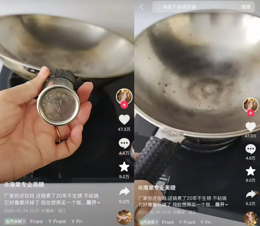 今年10月24日,一位账号名为@海棠专业美睫 的用户发布了一条15秒的视频。视频中,她将镜头对准一口炒锅,并进行了全方位的展示,文案则是“厂家你还在吗?这锅煮了20年,不生锈,不粘锅,好像要坏掉了,现在想再买一个去哪里买”。