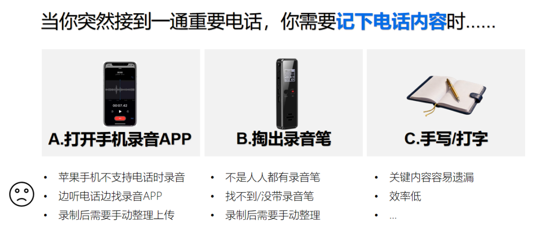 - 传统录音笔需要特意携带,也并非人人都有,录音之后的整理也让人无比头大;