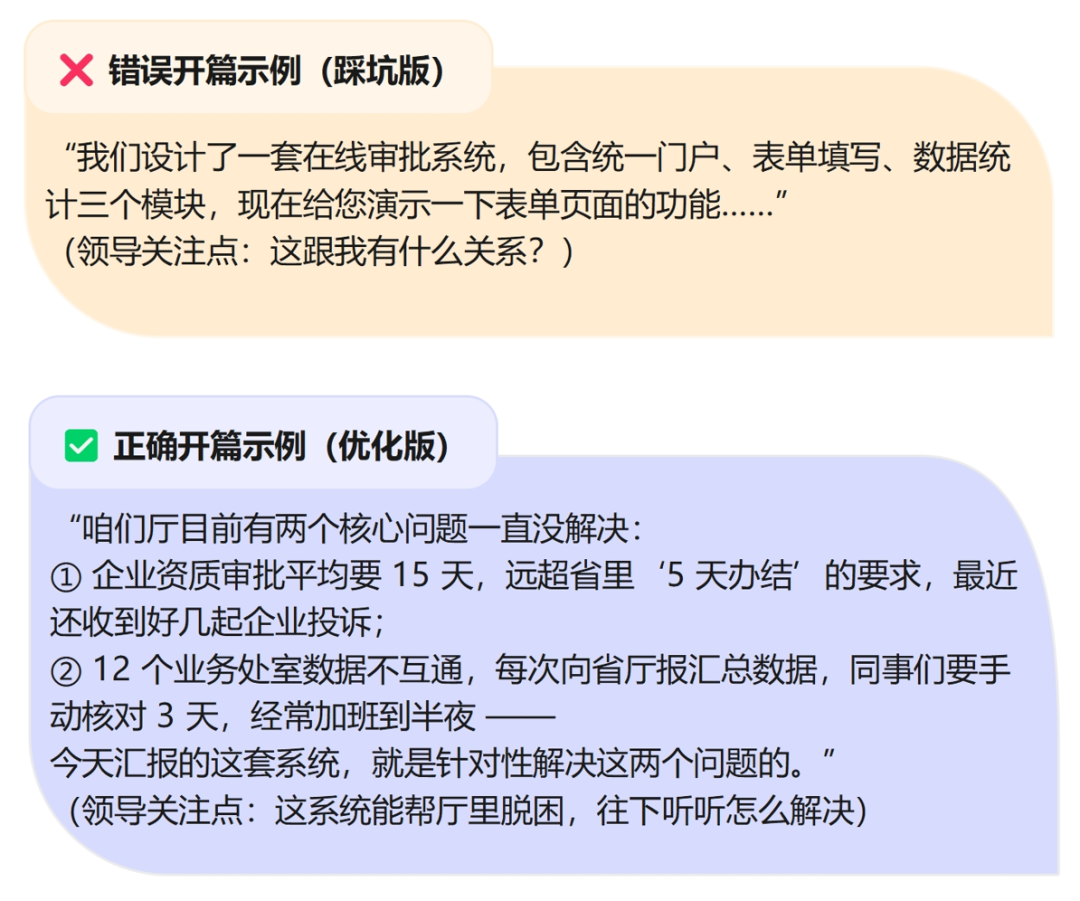 我们之前踩过的坑:汇报开篇就说 “系统包含统一门户、表单填写、数据统计三个模块”,结果领导听 10 秒就走神 —— 不知道系统跟厅里的问题有啥关系。