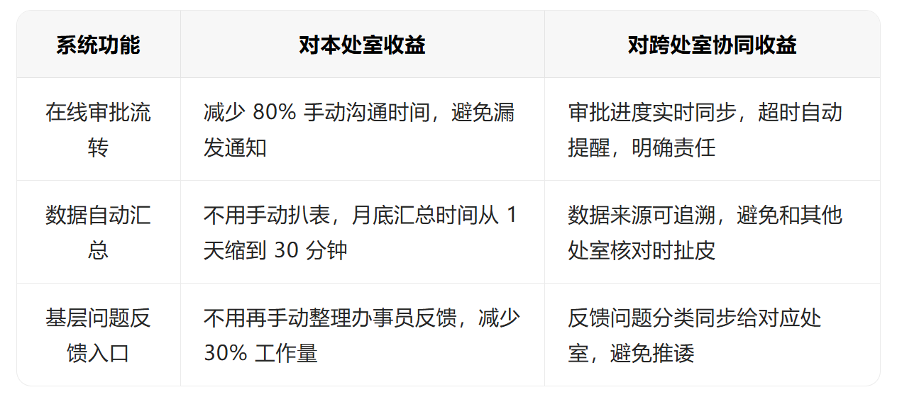 ① 对咱们处室:跨处室审批不用再手动发 3 次通知、收纸质材料,您这边的沟通时间能从 2 天缩到 2 小时,还能随时看审批进度,不用再被办事员追问;