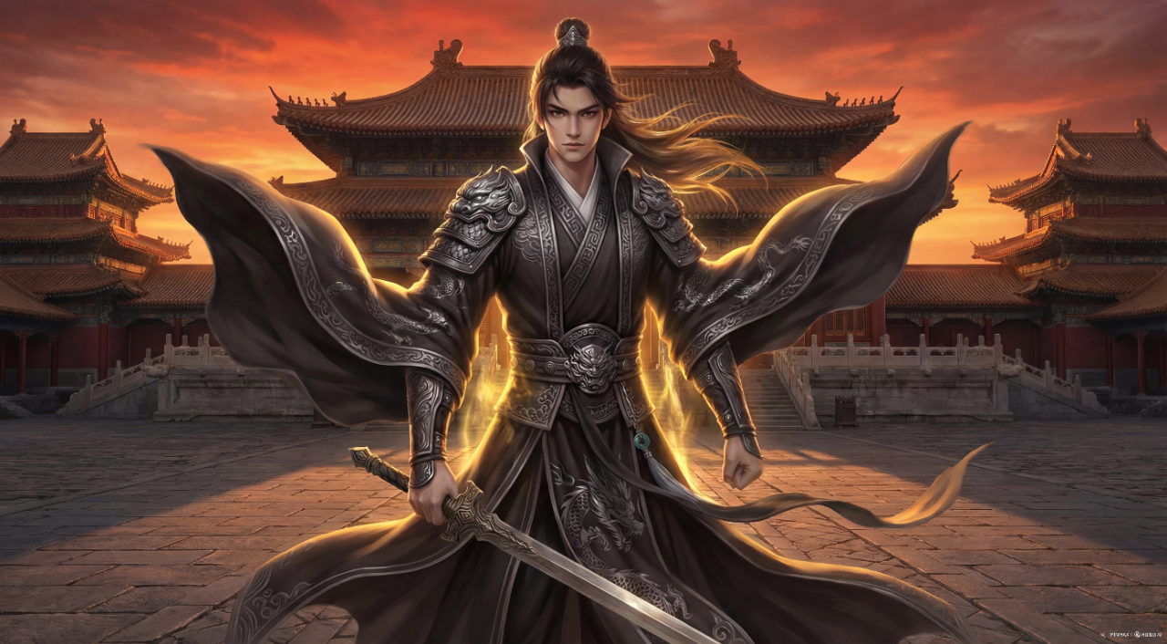 背景:黄昏,落日,宏伟的中式宫殿,飞檐翘角。