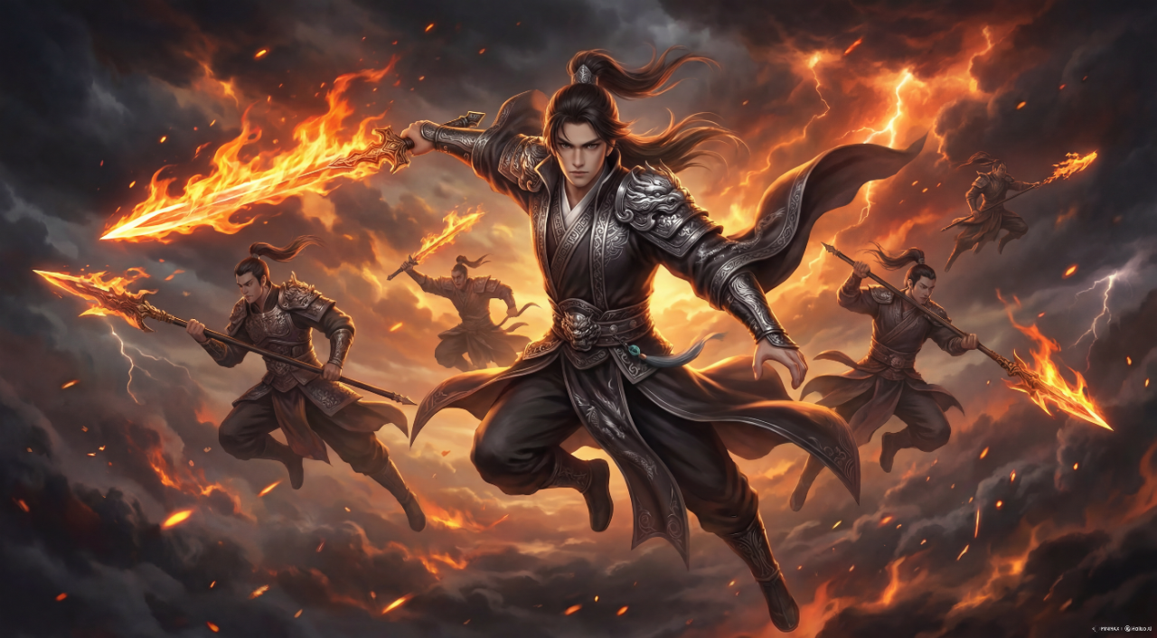 一群中国古代武士在空中,前景一人持火焰剑向前冲锋,背景其他人持火焰武器飞舞,身处烈焰云与黑暗stormy 天空中,超写实CG,史诗奇幻战斗,强烈动感,戏剧化光影,鲜明的橙黑配色。