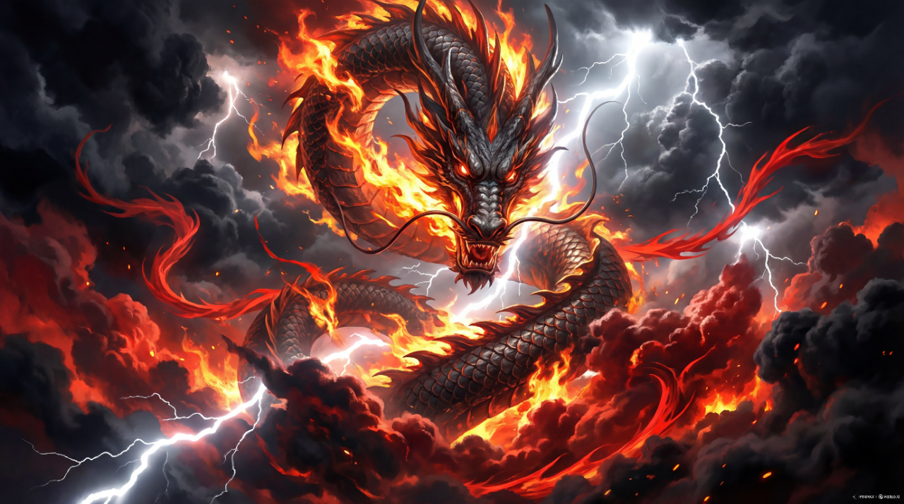 史诗奇幻风格,以图中东方龙为核心,周身烈焰燃烧,鳞片具有金属光泽,龙须飘动,红眼凌厉。它在乌云翻涌、闪电肆掠的天空下缓缓游动,它口中持续喷吐火柱倾泻而下。