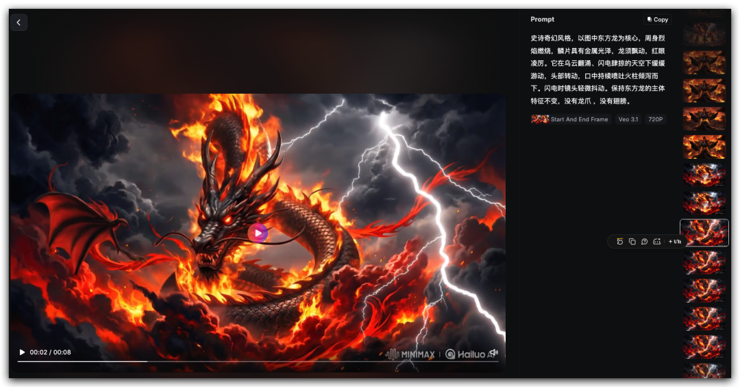 这里龙保持了完美的一致性,而且整个视频很自然,场景也比较震撼。同样自带了音效。