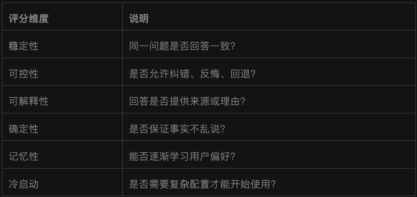 上述的三个维度决定了智能体是否好用并且让用户爱用,而决定用户是否敢用的,是体验的可信度。智能体的体验可信度,决定了用户愿不愿意把决策权交给它。