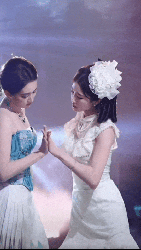 她们一个复刻现代的满天星造型,另一位主播“小鱼”则扮成民国剧《金粉世家》中刘亦菲饰演的“白秀珠”,两人手牵手一起跳舞。
