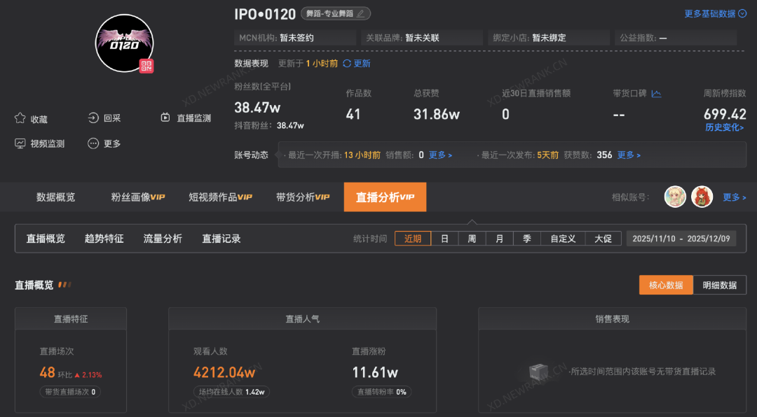 近30天,“IPO·0120”抖音账号共直播48场,累计观看人次超4212万次,通过直播涨粉11.61万,其旗下主播柳柳的抖音账号“IPO·柳柳”的粉丝量则从零增长至9.6万。