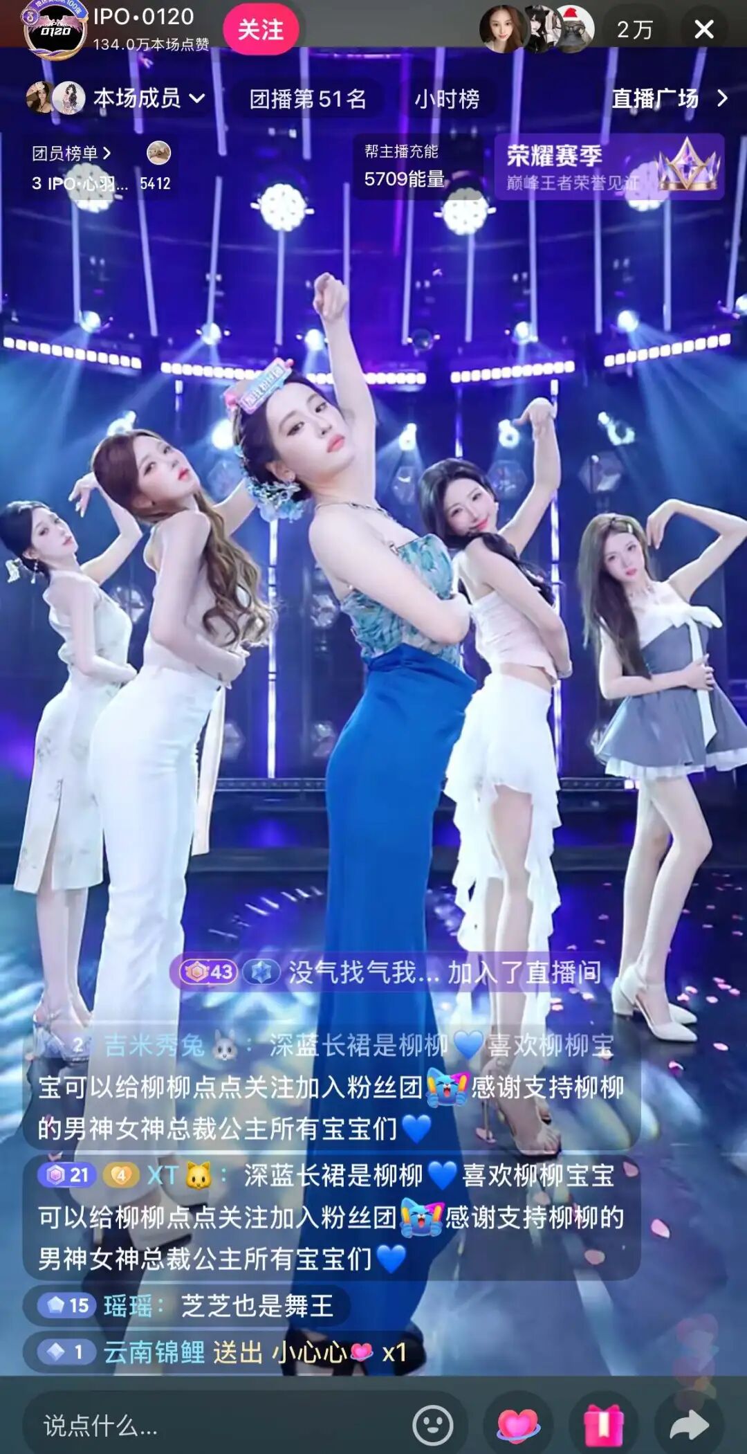 12月9日,新榜编辑部点进“IPO·0120”抖音直播间,正看到柳柳扎着刘亦菲的满天星造型,配着一曲DJ音乐跳舞,直播间在线人数达到2万人,当柳柳下场休息由其他人站C位跳舞时,直播间的在线人数很快下滑至1万人。