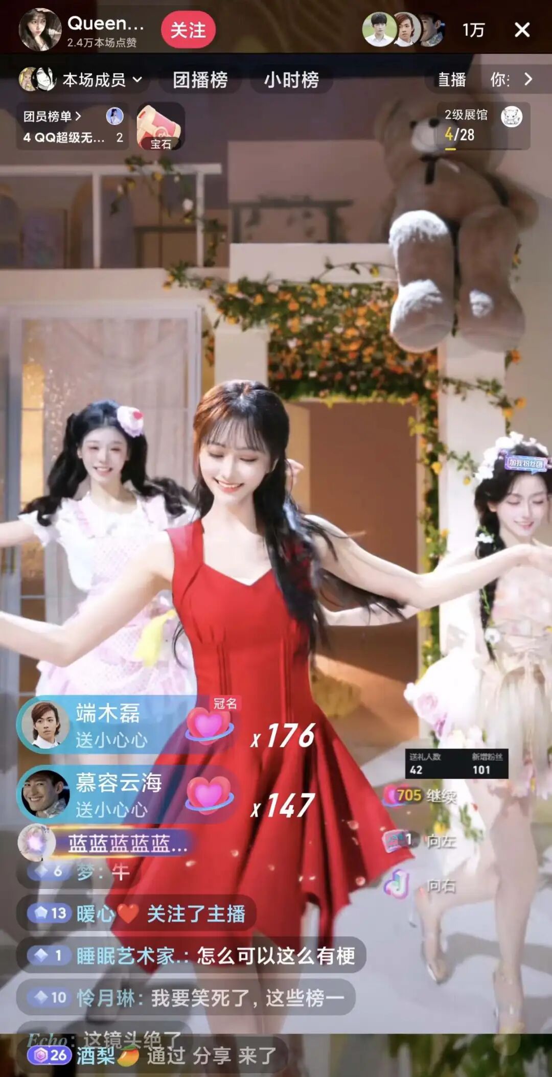 团播账号“Queen&Queen”则另辟蹊径,模仿《微微一笑很倾城》的女主角“贝微微”,主播穿着红色连衣裙跳起《爱的华尔兹》,配上直播间极具氛围感的打光,颇有些白月光回归的意味。