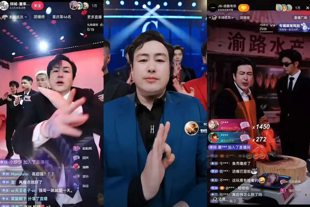 大概同一时期,“小颂文”也转型团播赛道,没在直播间模仿高启强杀鱼,而是站在一群“西装男”面前跳舞。
