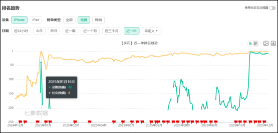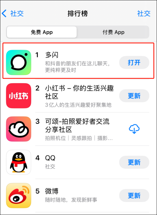 2025年11月,多闪登顶App Store社交应用榜首,且跻身免费总榜前列。