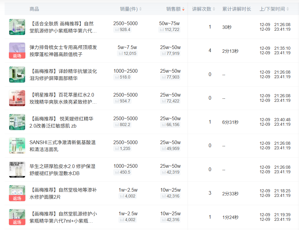 12月4日,@画梅 在朋友圈宣布将于近几天重新开播。12月9日晚上9点,他在抖音复播,预估销售额为750万-1000万元,总观看人次达到591.4万,人气峰值为18.6万。截至发稿,@画梅 的抖音粉丝量从退网时最低点(419万)回升至471万,显示出强大的粉丝粘性和顶流号召力。