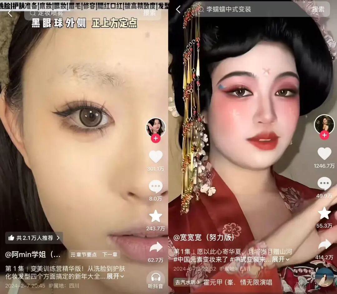 从内容上来看,一方面,仍在不断涌现出具有不同特色的风格化创作者,他们善于探索美妆垂类的创作边界,且愿意耗费大量时间打磨作品;另一方面,从内容类型到表达方式,越来越卷的美妆赛道中则卷出了更加精致、更有创意的多样化内容。比如@宽宽宽(努力版)的一条变妆视频点赞突破1200万、美妆创作者@阿min学姐(包教包会版) 的一条精细化妆教视频点赞突破300万。