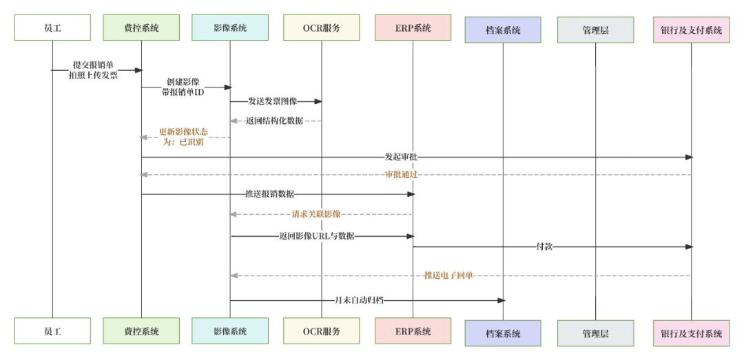 小结:财务电子影像系统的集成不是“点对点对接”,而是构建一个以影像为纽带的财务数据生态。以典型集成场景:费用报销全流程,来诠释电子影像系统在集成系统之间的数据流情况,如下图所示。
