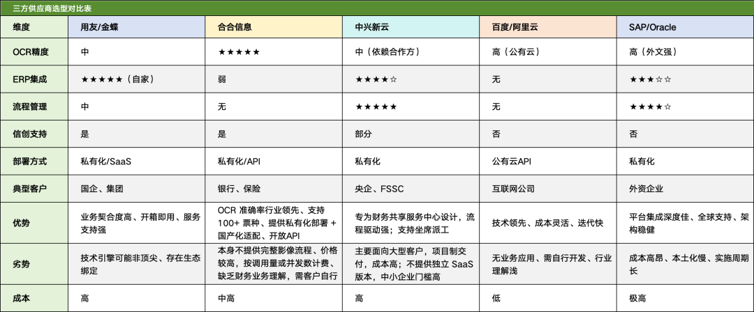 电子影像系统作为财务共享平台基础设施,作为企业财务数字化的关键组件。在这个市场里面不泛优秀企业,市场上既有综合型ERP厂商,也有专业影像/OCR 厂商和财务共享解决方案商。以下是主流第三方系统供应商的分类、代表厂商及其优劣势分析。
