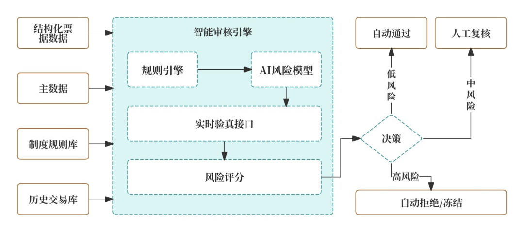 目的:利用AI、规则引擎和大数据分析技术,对报销单据、付款申请、发票等财务凭证进行自动化风险识别与合规性检查的核心功能模块。它将传统依赖人工经验的“事后审计”转变为事中控制、事前预警的智能风控体系。