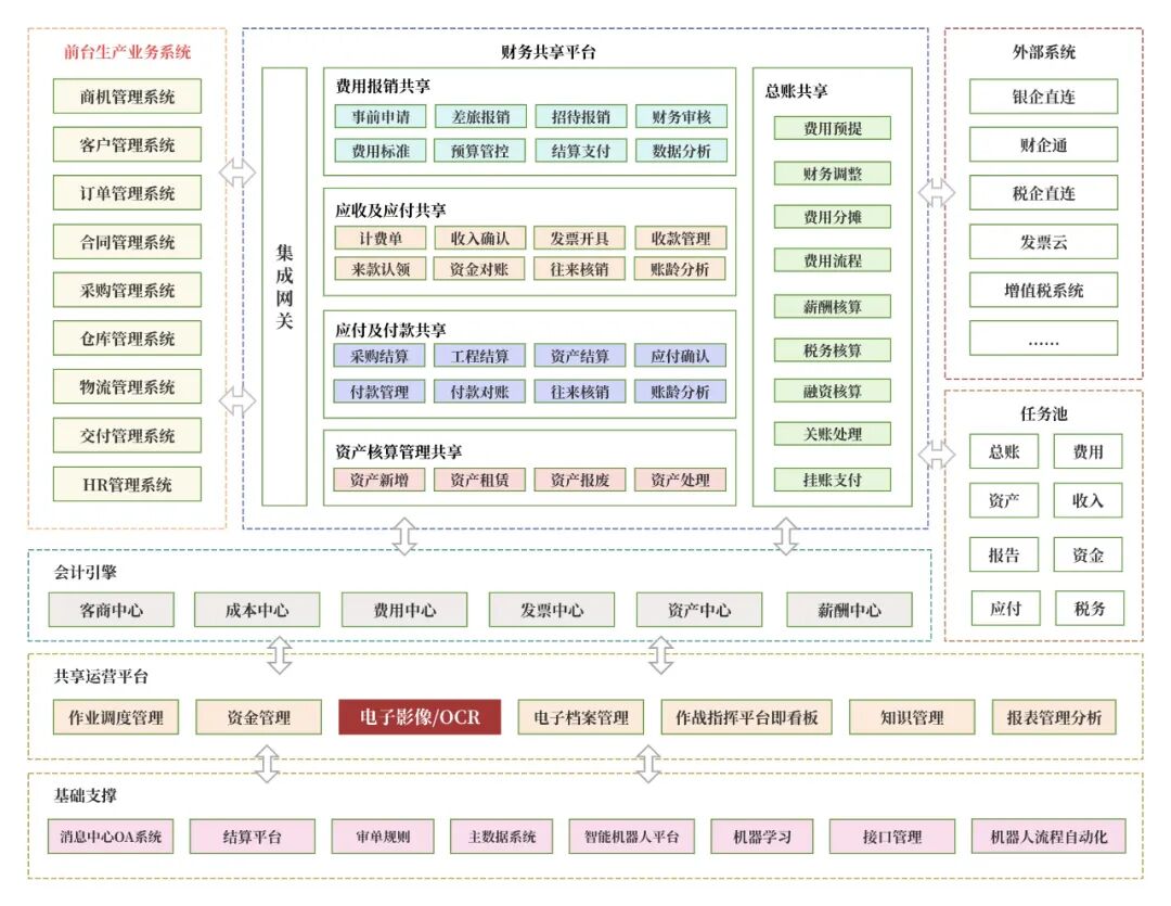今天很有必要和大家来捋一捋:电子影像系统(EIS),就让我们先看张财务共享中心系统整体架构图开始,建立感觉,如下图所示。