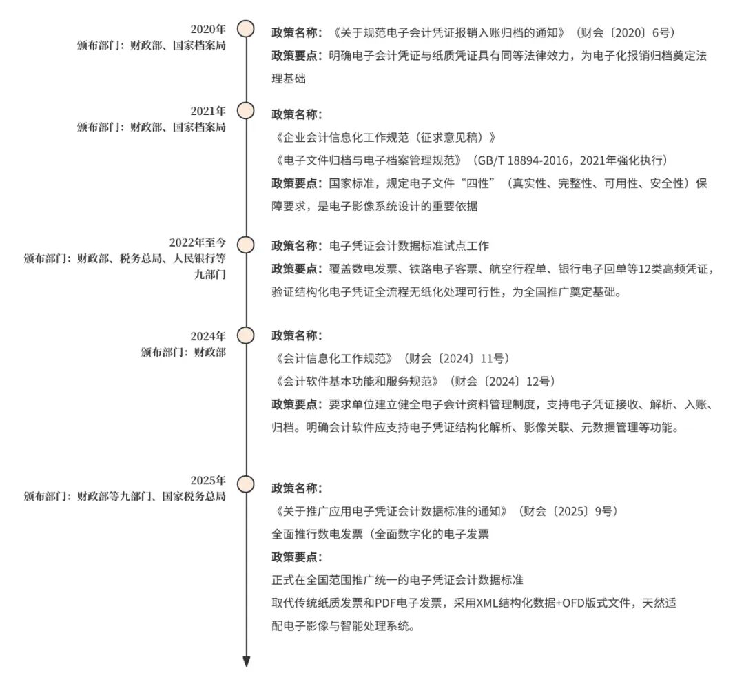 有了市场需求、技术发展外,当然国家政策支持也很重要。通过一系列政策组合拳,明确国家层面对会计数字化的决心、制定统一标准、打通数据孤岛、明确实施路径与时间表,推动全面落地。对于企业而言,建设或选型财务电子影像系统,已成为不可回避的合规前提和核心选型指标。围炉梳理了近五年电子影像系统相关政策,如下图所示: