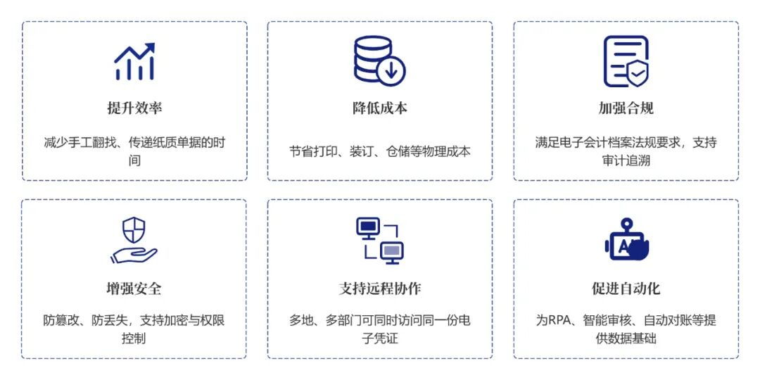目标:实现财务凭证的无纸化、结构化、可追溯、可审计;支撑财务共享、智能审核、自动对账、电子归档等高级应用。