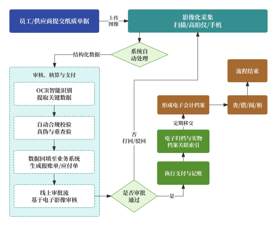 官方定义:通过数字化技术,将企业在财务活动中产生的各类原始凭证、票据、合同、报销单据等纸质或电子文档,转化为标准化的电子图像,并结合业务数据进行采集、处理、存储、管理、调阅和归档的一体化信息系统。