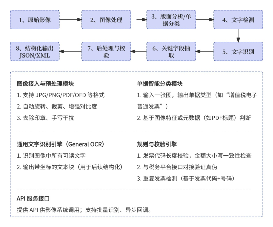 OCR识别模块的本质:从图像中定位文字区域 -> 识别字符内容 -> 结构化输出关键字段。在财务场景下,还需结合模板匹配、语义理解与规则校验,以提升准确率和可用性。如下图所示:
