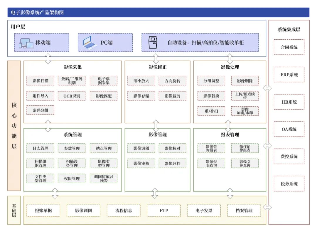 产品架构关注为用户提供了哪些功能模块,即体现业务价值;技术架构关注系统底层如何构建和运行,实现产品并保障系统稳定高效。下图为电子影像系统产品架构图,如下所示。