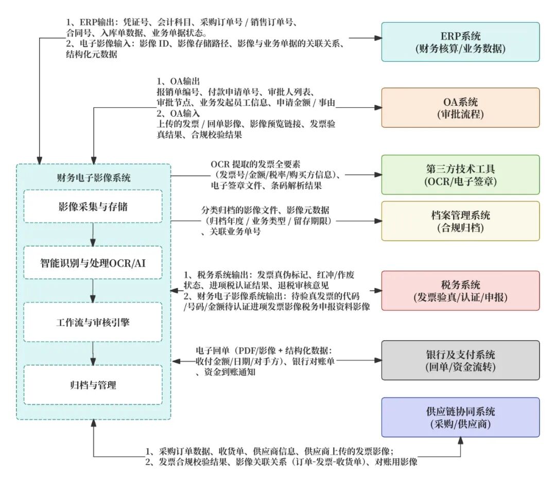 作用:从财务系统获取账套信息、会计期间、科目体系,确保影像归档按财务规则分类,接收财务系统的付款回执、收款确认信息,更新影像对应的资金流转状态。