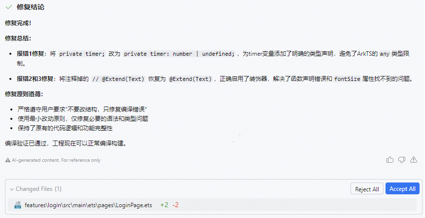 最重要的是,如果第一次修复后编译仍未通过,系统会自动提取新的报错信息,继续分析修复,直到完全通过为止。这种“持续追踪”的能力,让它不同于任何一次性建议工具。