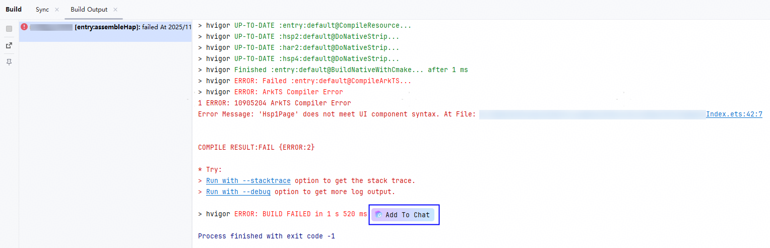当应用出现编译报错时,控制台会出现醒目的“Add To Chat”按钮。点击它,当前的报错信息会自动提取到我们的智能插件CodeGenie中。