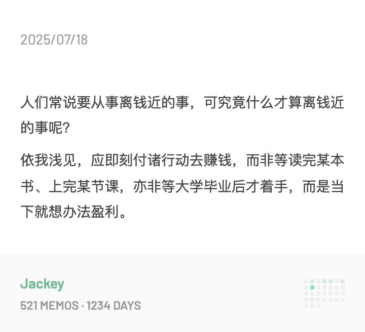 如果你想检验你现在做的事情是不是离钱近的事情,那不妨问自己一个问题,