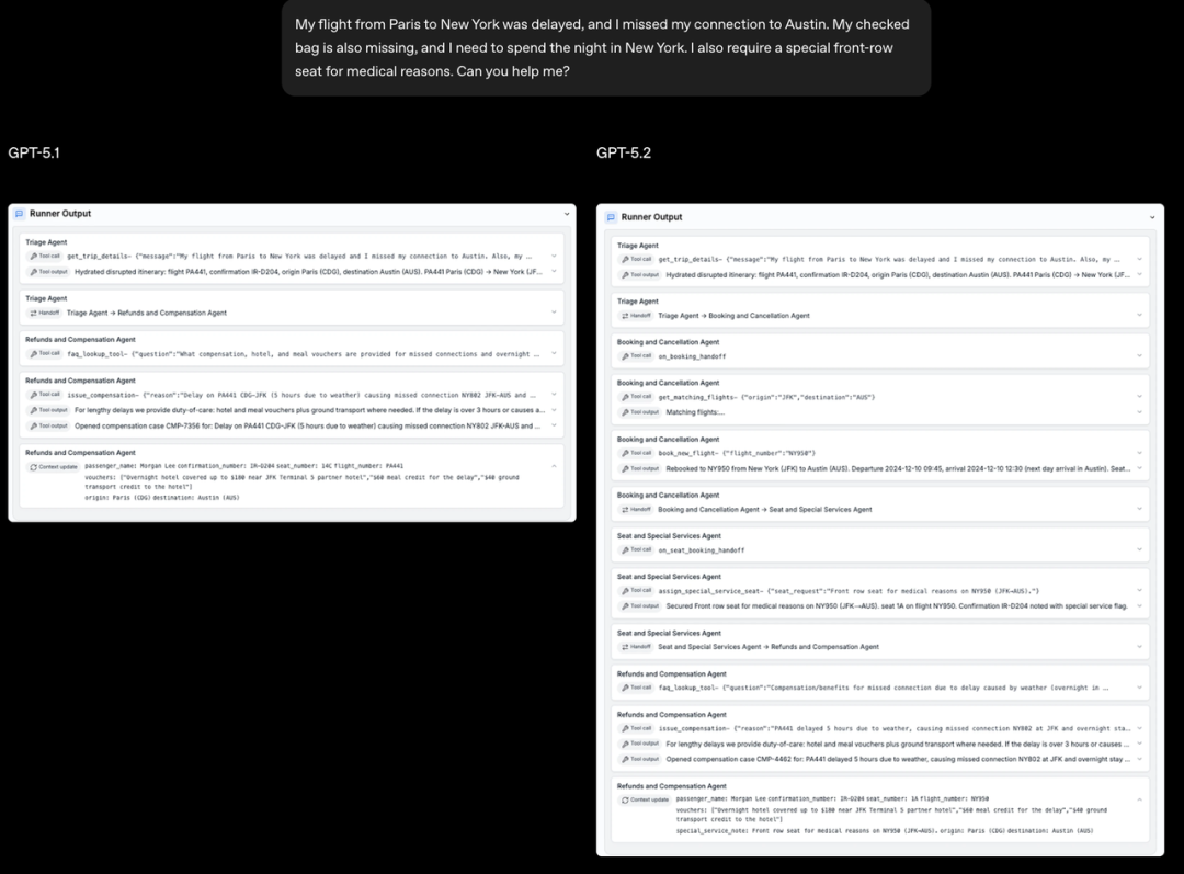 GPT-5.1处理这种多步骤任务时,经常顾此失彼,比如订了票忘了安排住宿,或者安排了住宿忘了申请赔偿。但GPT-5.2能把整个任务链管理得井井有条,每一步都不落下。