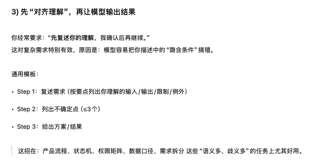 – 设计逻辑:这就像工作中一样,老板开会结束后通常都会问这么一句,来确保大家信息是对齐的,我们和大模型的关系也同样。